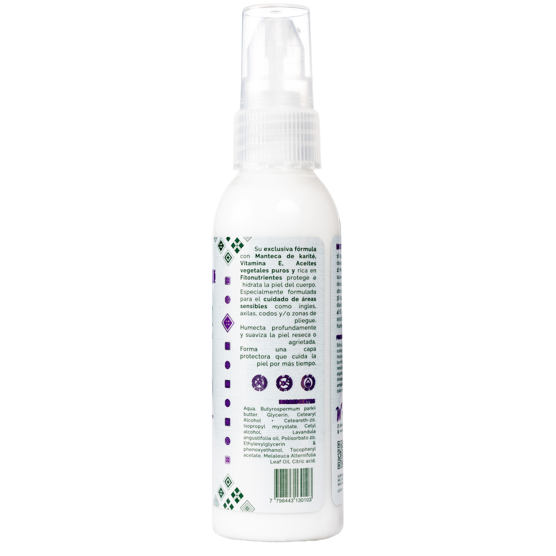 Su combinación de Tea Tree, Lavanda, Manteca de Karité y Vitamina E ayuda a mantener la piel hidratada, suave y saludable. Está especialmente indicada para el cuidado diario de zonas sensibles como ingles, axilas, codos, zona de pliegues y genital, donde la piel suele ser más propensa a irritaciones o resequedad.